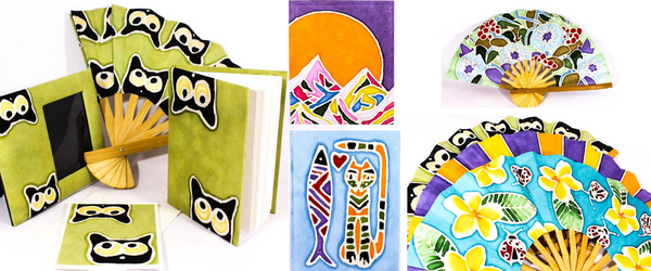 La carta artigianale di TDC (Thailandia) ha una texture morbida e porosa, che valorizza la decorazione con tecnica batik. Nascono così quaderni, cornici, ventagli, biglietti colorati e allegri, perfetti per bomboniere, piccoli regali e per rendere speciale la casa.