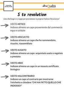 L’abbiamo chiamata #5torevolution, perché ti proponiamo 5 modi di vestire etico e responsabile. Puoi farla in 5 giorni, ogni giorno un modo diverso, oppure tutti insieme. Se ti va poi pubblica la foto sui social con l’hashtag #5torevolution e magari cita anche noi di @altraqualita, @altromercato e @equogarantito. Oppure puoi inviare la foto a noi che la pubblicheremo sulla nostra pagina facebook insieme alle nostre (guarda qui l’anno scorso quanti hanno fatto Fashion Revolution con noi).
