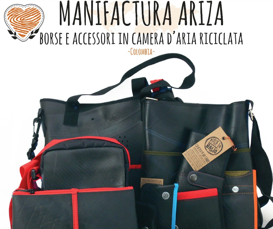 Materia prima insolita ma resistente e morbida, la camera d’aria riciclata è disponibile in grandi quantità, poiché proviene dalle gomme dei Tir che circolano numerosi per le strade di Bogotà. La camera d’aria inoltre è molto versatile e si presta a sostituire la pelle in tante lavorazioni. Consapevoli delle grandi possibilità di questo materiale, gli artigiani del laboratorio di Donna Rosa Ariza alla periferia di Bogotà, insieme ai designer di Sapia, creano con la camera d’aria ogni sorta di borse e accessori.