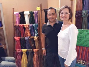 Al World Fair Trade Week abbiamo presentato e ospitato insieme a Scambi Sostenibili anche il bel progetto egiziano Yadawee da cui provengono le sciarpe descritte sopra. Abbiamo avuto così l’occasione di parlarne con Hisham El Gazzar, il rappresentate dell’organizzazione (in foto con Eva di Scambi Sostenibili).
