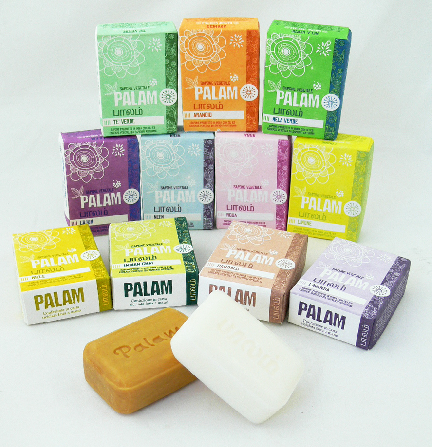 I saponi Palam sono disponibili in 11 differenti profumazioni (rosa, sandalo, limone, neem, lilium, lavanda, indian chai, miele, tè verde, mela verde, arancio) e sono prodotti impiegando essenze e oli vegetali reperibili sul mercato locale. Non contengono coloranti e per la loro produzione non si utilizzano processi di stabilizzazione tossici, per finire, anche la confezione, in carta riciclata, è fatta a mano da artigiani indiani.