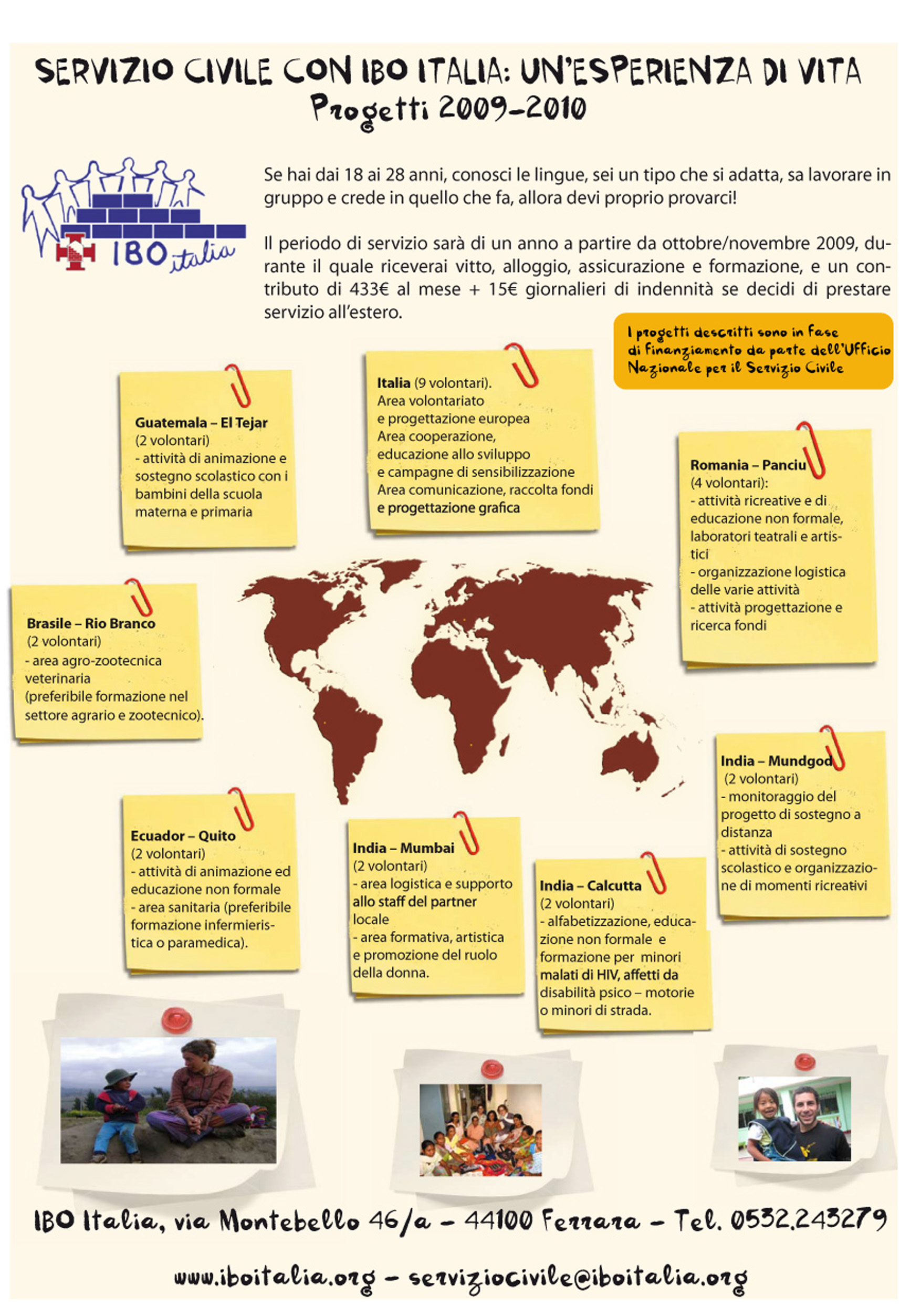 IBO Italia offre anche quest’anno l’opportunità, per i giovani dai 18 ai 28 anni, di impegnarsi con e per gli altri scegliendo un progetto di servizio civile in Italia o in diversi paesi d’Europa, Asia e America Latina. Dal 2005 già 71 volontari hanno scelto IBO Italia per dedicare un anno della propria vita all’impegno, alla solidarietà, alla costruzione dal basso di una società più giusta fatta di storie, culture e provenienze diverse che incontrandosi si arricchiscono reciprocamente.