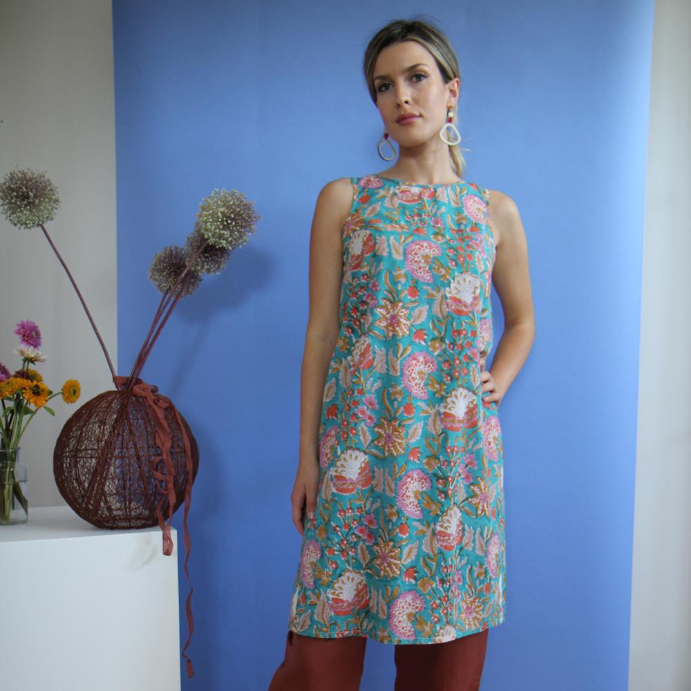 stampa a mano blockprint disegno Prato Fiorito multicolore su base pavone
