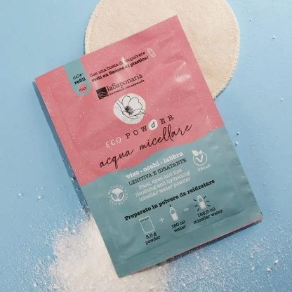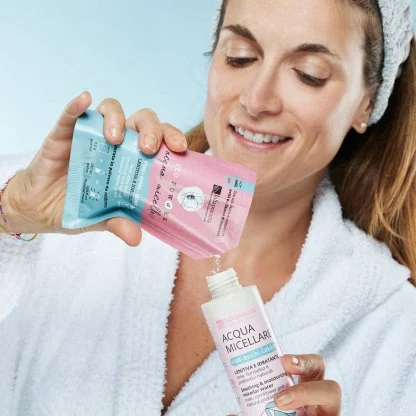 Disciogli i suoi cristalli nel tuo flacone preferito e utilizzala come una normale acqua micellare con l’aiuto di un dischetto riutilizzabile.