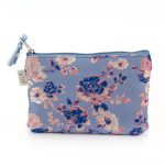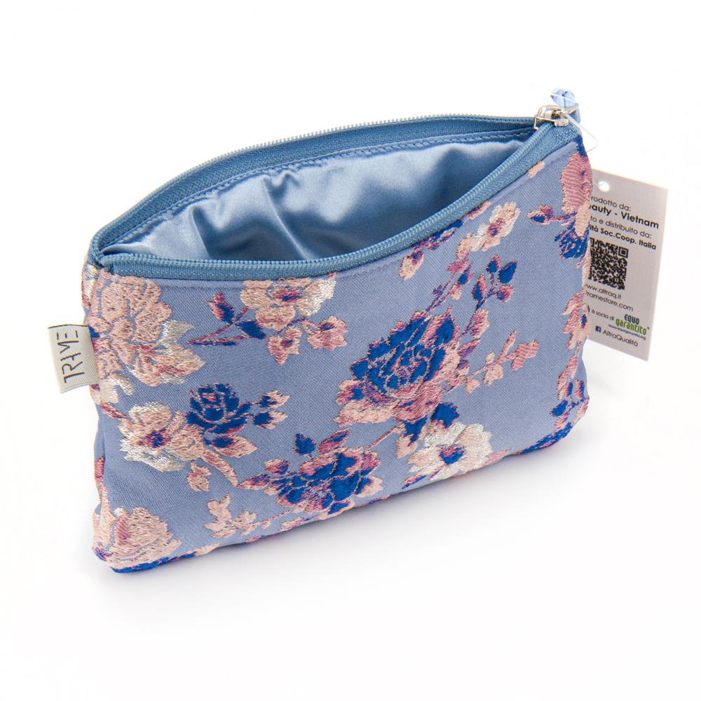 Astuccio in cotone broccato, fantasia floreale su colore base carta da zucchero. Chiusura con zip. Interno foderato. Tasca esterna con zip. 16,5×11 cm