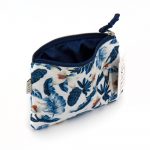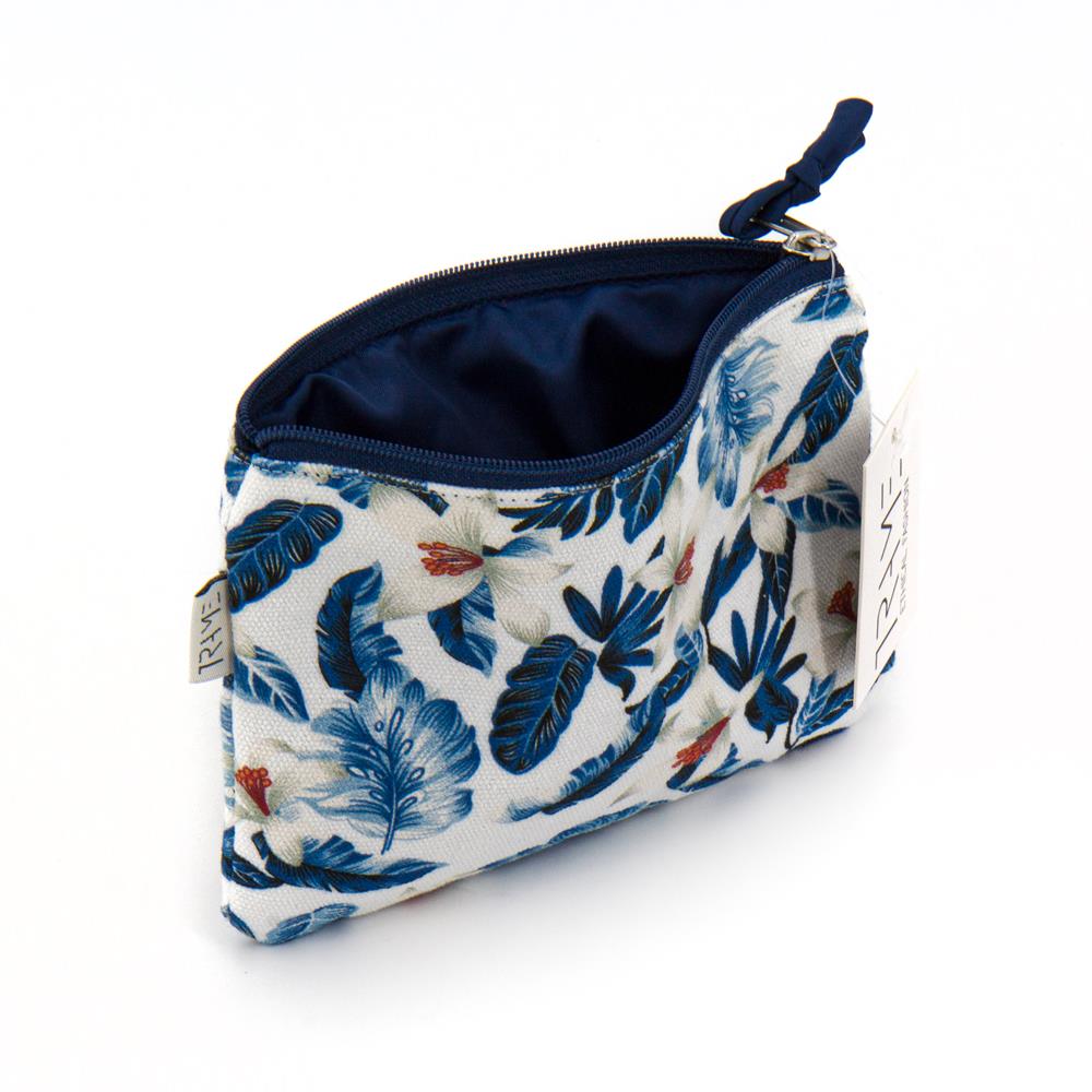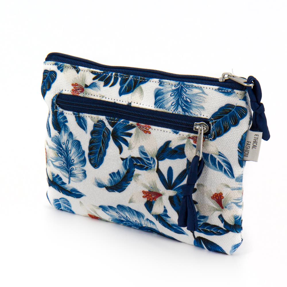 Astuccio in cotone canvas stampato su colore base blu cobalto. Chiusura con zip. Interno foderato. Tasca posteriore con zip. 16,5x 11 cm
