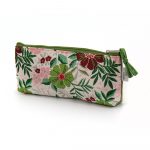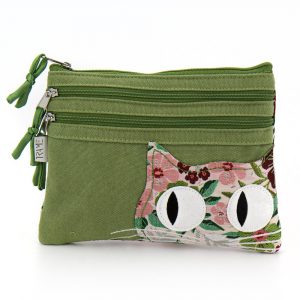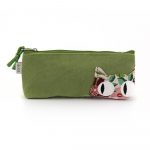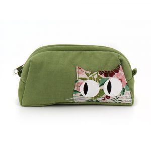 Astuccio portapenne in cotone canvas colore verde e applicazione frontale gatto in cotone broccato con fantasia floreale. Retro in cotone broccato con fantasia floreale. Chiusura con zip. Interno foderato. 20×9 cm