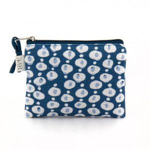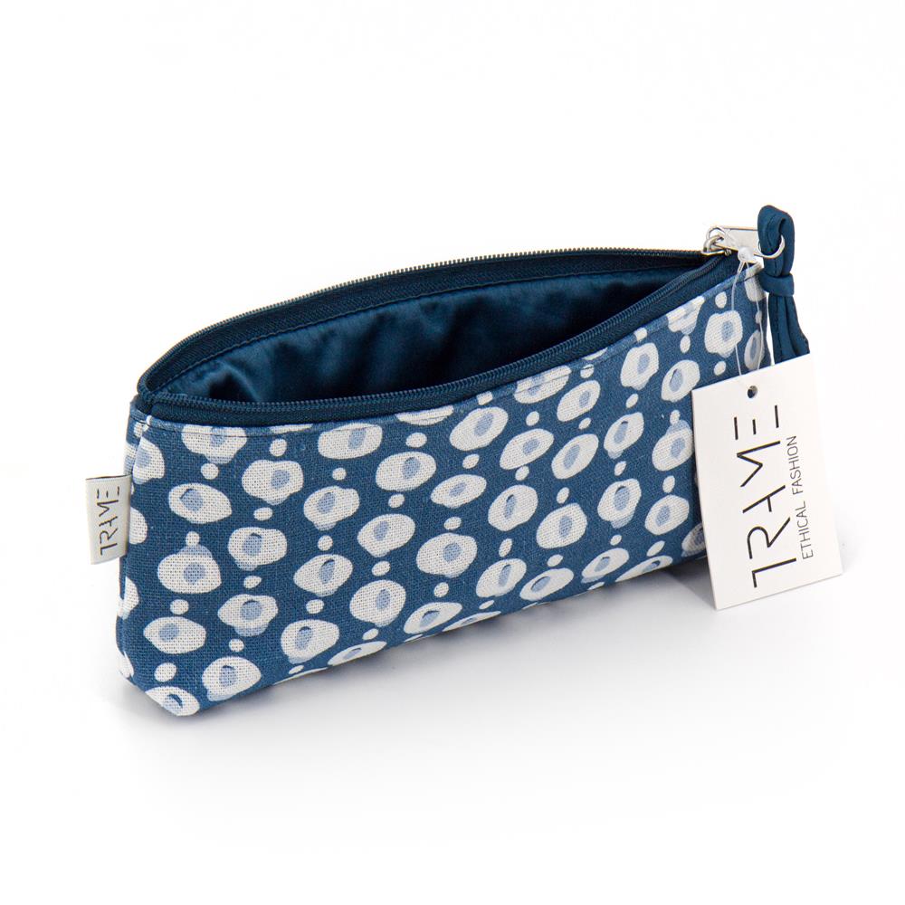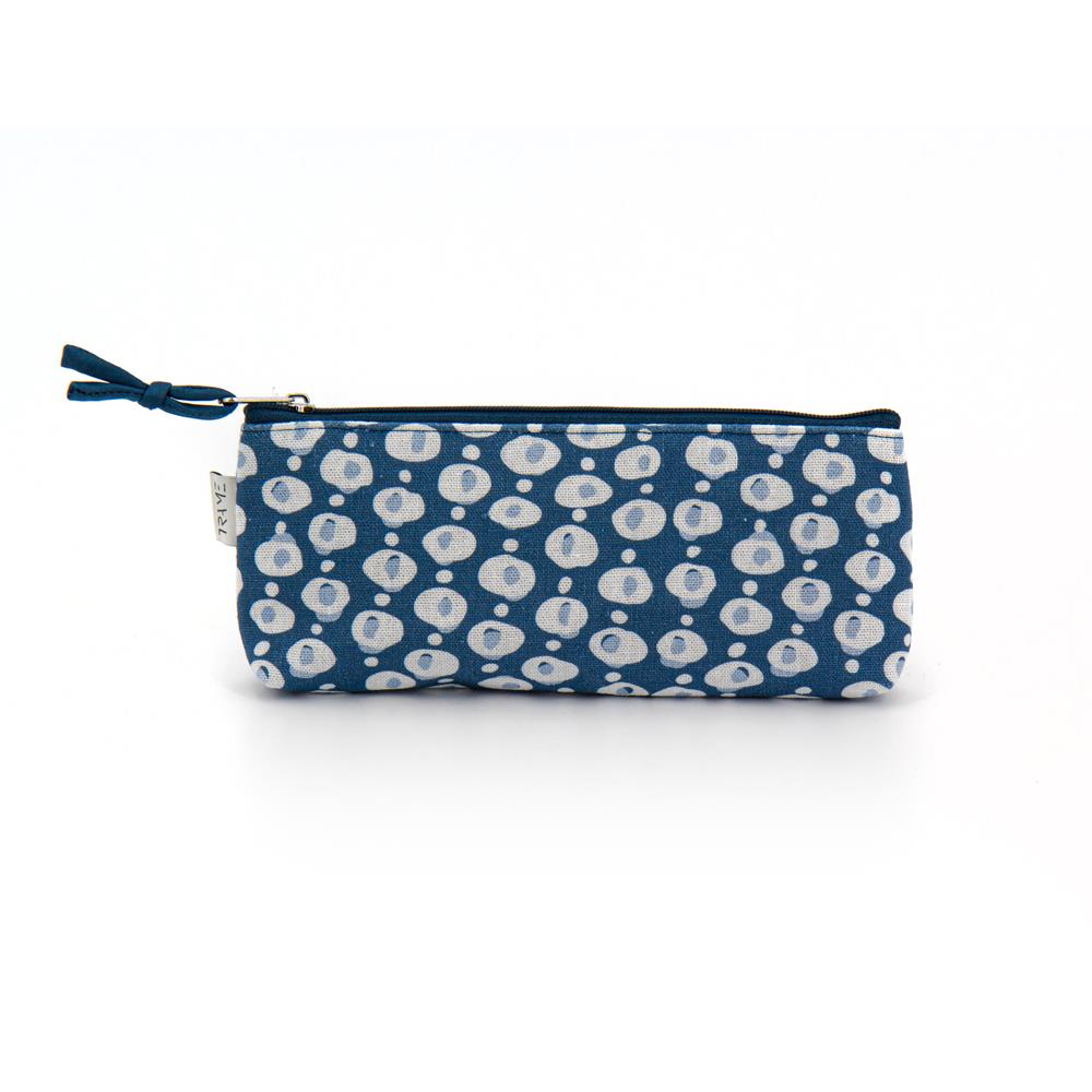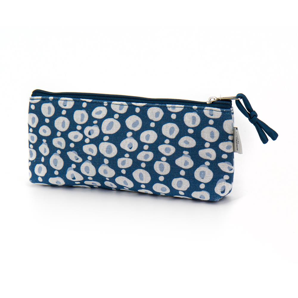 Astuccio portapenne in lino stampato su colore base blu denim. Chiusura con zip. Interno foderato. 20×9 cm