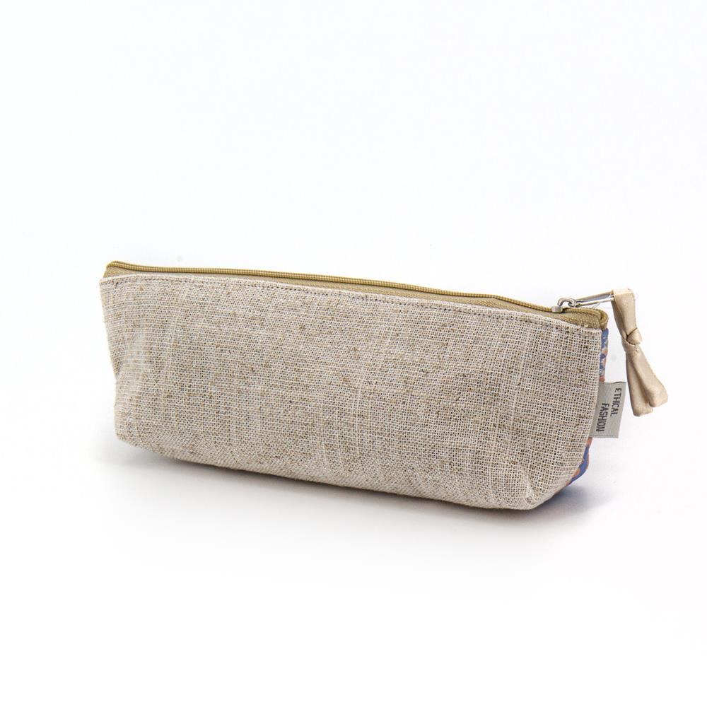 Astuccio portapenne in mix di tessuti e fantasie su base lino ecrù. Chiusura con zip. Interno foderato. 22,5×7 cm