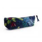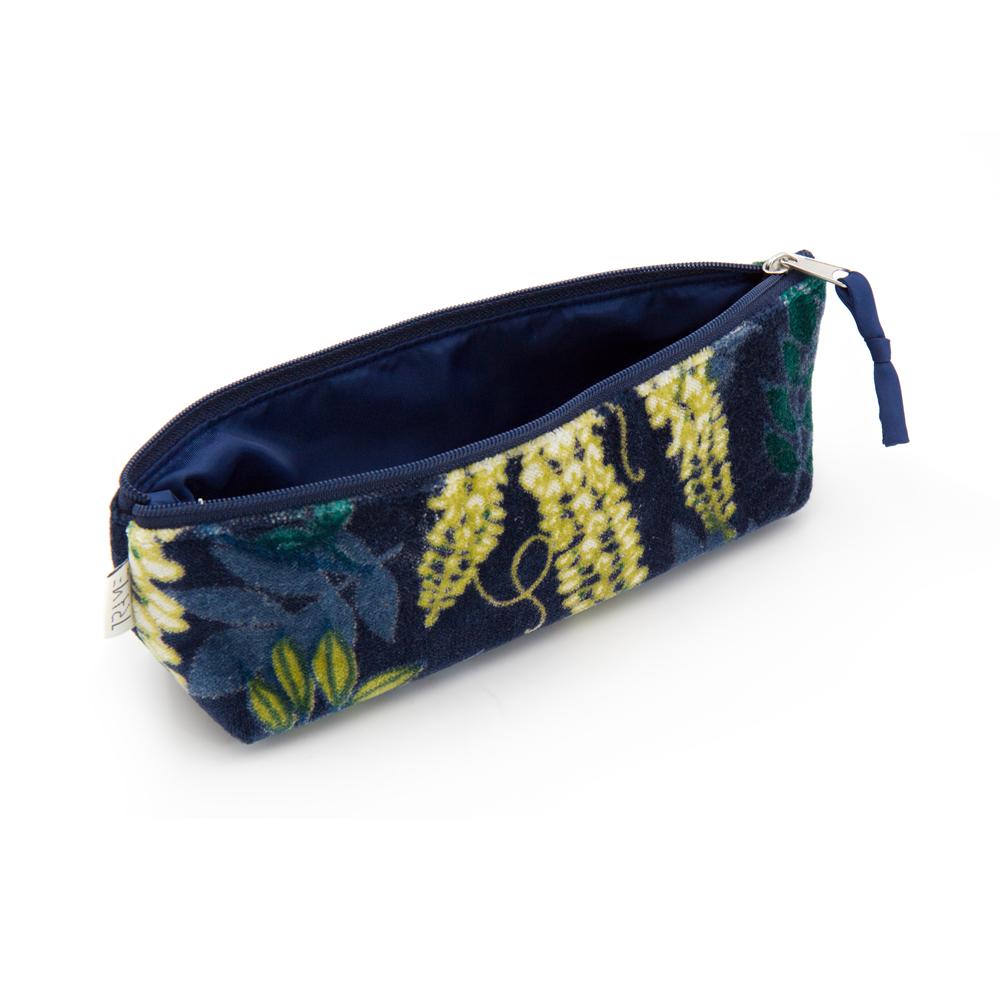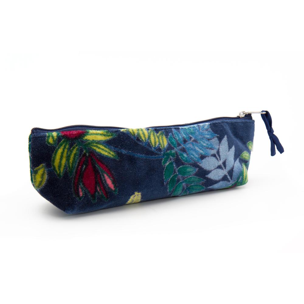Astuccio portapenne in velluto liscio con stampa floreale su colore base blu. Chiusura con zip. Interno foderato.