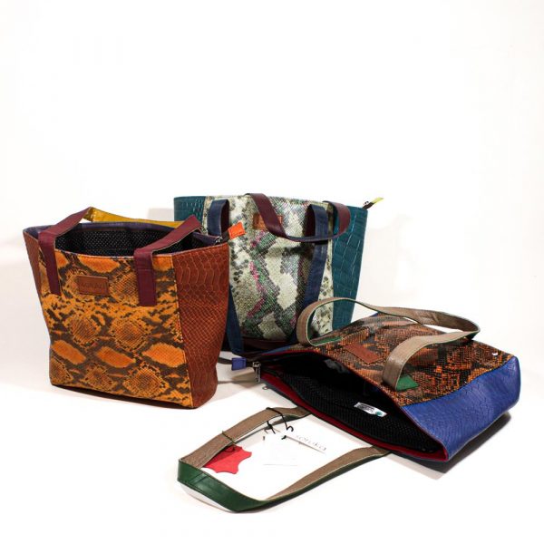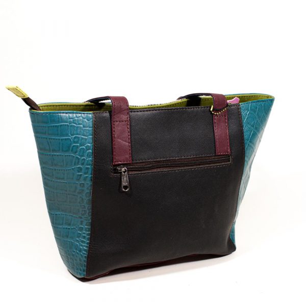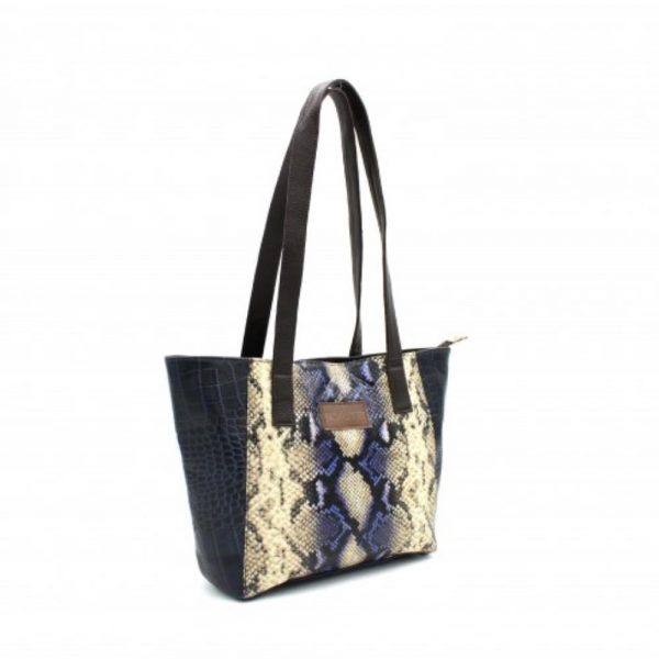 Borsa a spalla con manici, stampa effetto coccodrillo, presenta una tasca interna e una esterna con zip più due taschini interni. Fondo impreziosito da piedini.