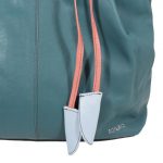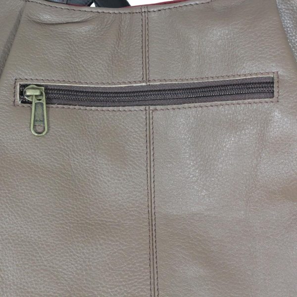 La borsa presenta una zip esterna sul retro e la chiusura è garantita da una zip. All’interno della borsa vi sono due tasche chiuse da zip. La prima è la classica tasca con zip su un lato della borsa, mentre la seconda è una tasca centrale che divide in due la parte bassa del grande scomparto interno.