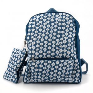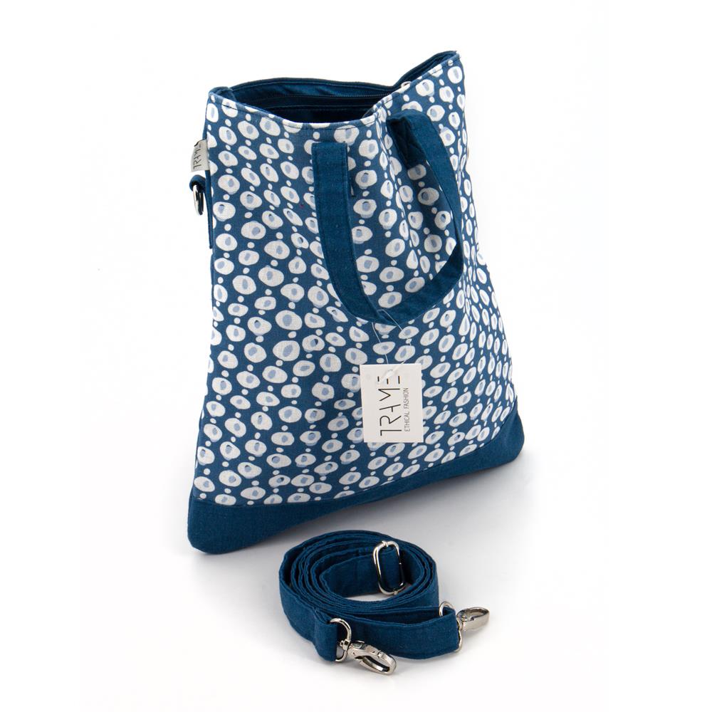 Borsa a mano grande in lino stampato su colore base blu denim. Dotata sia di manici che di una tracolla rimovibile e regolabile. Chiusura con zip. Interno foderato e una tasca con zip. Due tasche piatte sul retro. 31×35 cm