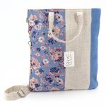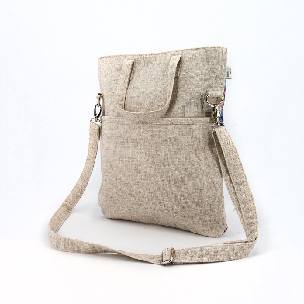 Borsa a mano grande in mix di tessuti e fantasie su base lino ecrù. Dotata sia di manici che di una tracolla rimovibile e regolabile. Chiusura con zip. Interno foderato e una tasca con zip. Due tasche piatte sul retro. 31×35 cm
