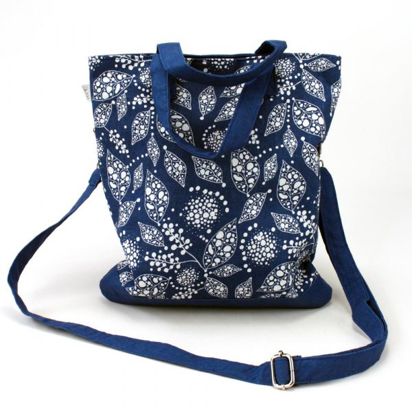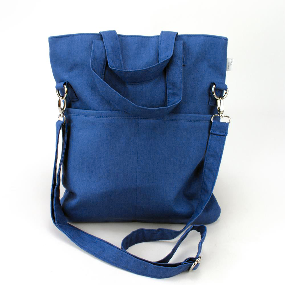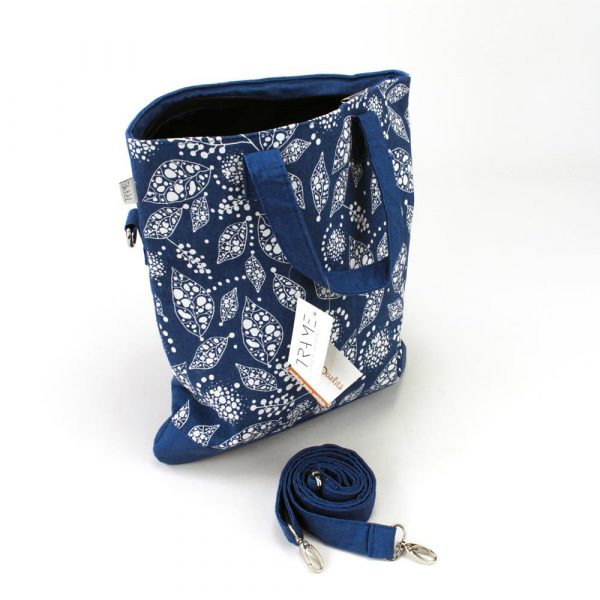 Borsa a mano grande in lino stampato su colore base bluette. Dotata sia di manici che di una tracolla rimovibile e regolabile. Chiusura con zip. Interno foderato con una tasca con zip. Due tasche sul retro.