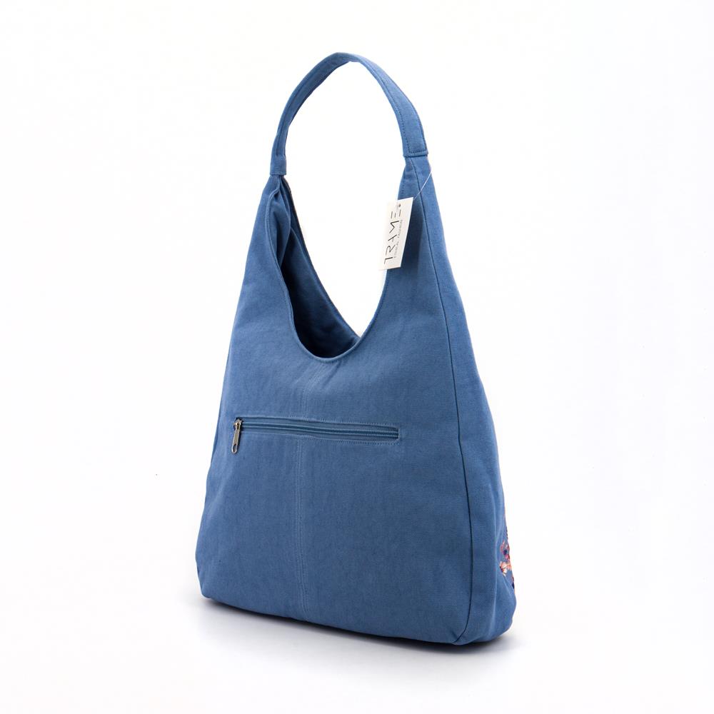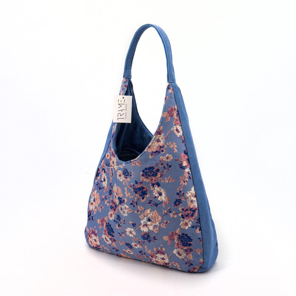 Borsa a spalla media in cotone broccato, fantasia floreale su colore base carta da zucchero e cotone canvas colore fiordaliso. Chiusura con zip. Tasca portaoggetti sul davanti. Tasca piatta con zip sul retro. Interno foderato ed una tasca con zip. 33,5x25x8 cm