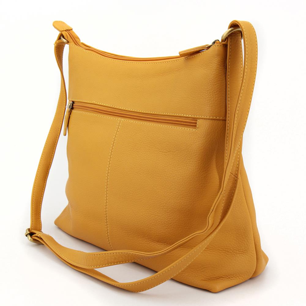 Borsa a tracolla media in morbida nappa bovina con chiusura a zip. Tasca piatta esterna con zip. Presenta un fondo che assicura stabilità all’accessorio pur conservando una struttura morbida. Tracolla regolabile. Interno foderato in cotone a righe con due comparti definiti, tasca portaoggetti e un tasca piatta con zip.