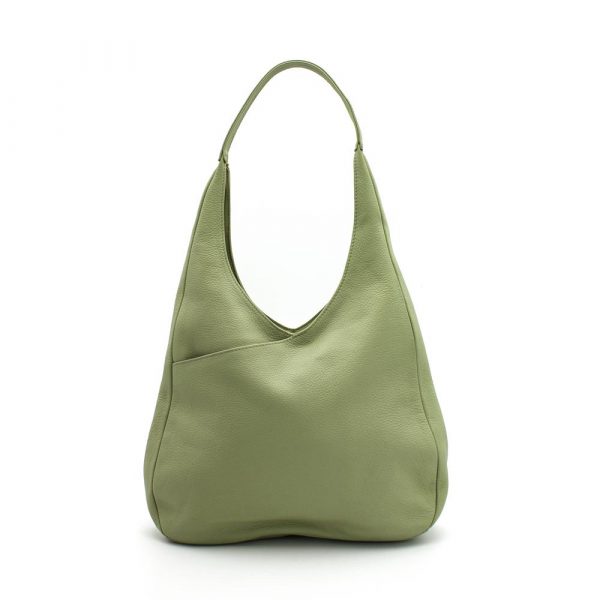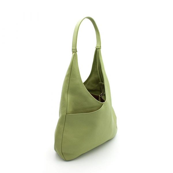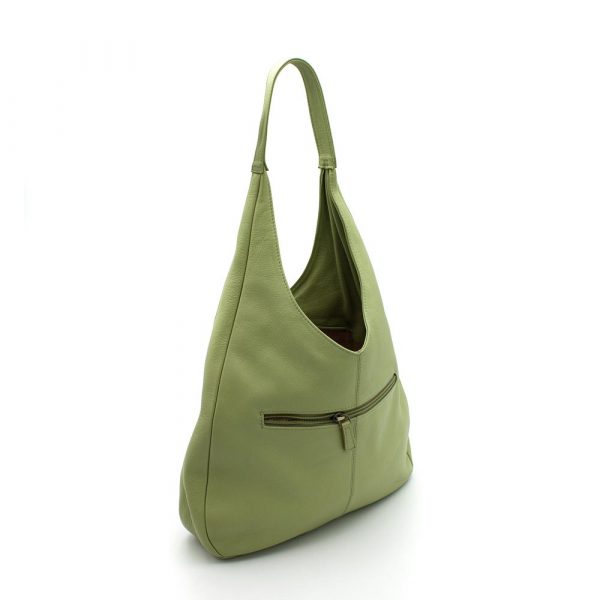 Borsa a spalla media in morbida nappa bovina. Forma ovale con chiusura zip in testa. Tasca a soffietto portaoggetti sul davanti. Tasca piatta con zip sul retro. Interno foderato in cotone a righe con due tasche portaoggetti una piatta con zip e una a soffietto. Manici tubolari.
