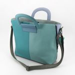 Borsa in pelle riciclata con struttura semirigida, pannelli cuciti a vista e combinazioni di pellame variabili. Dotata di manici e tracolla regolabile, chiusura superiore a cerniera e scomparto interno foderato con tasca aggiuntiva.