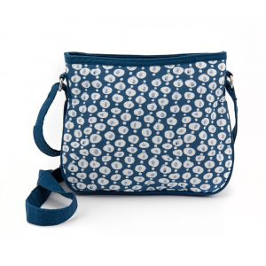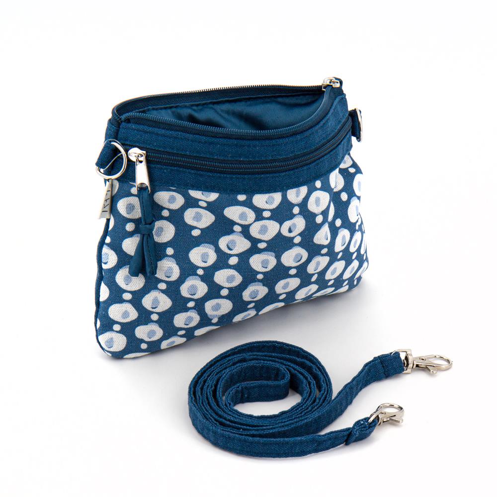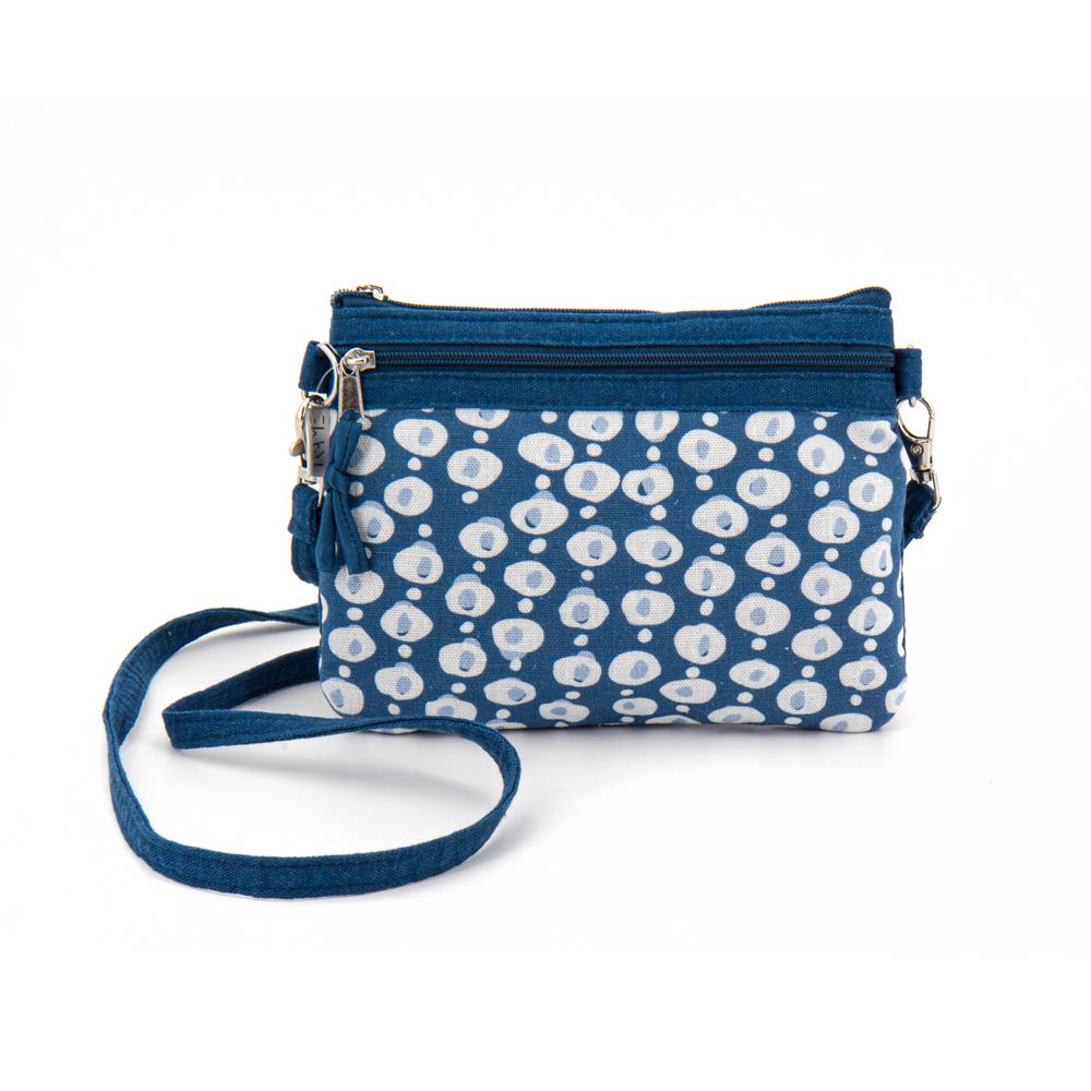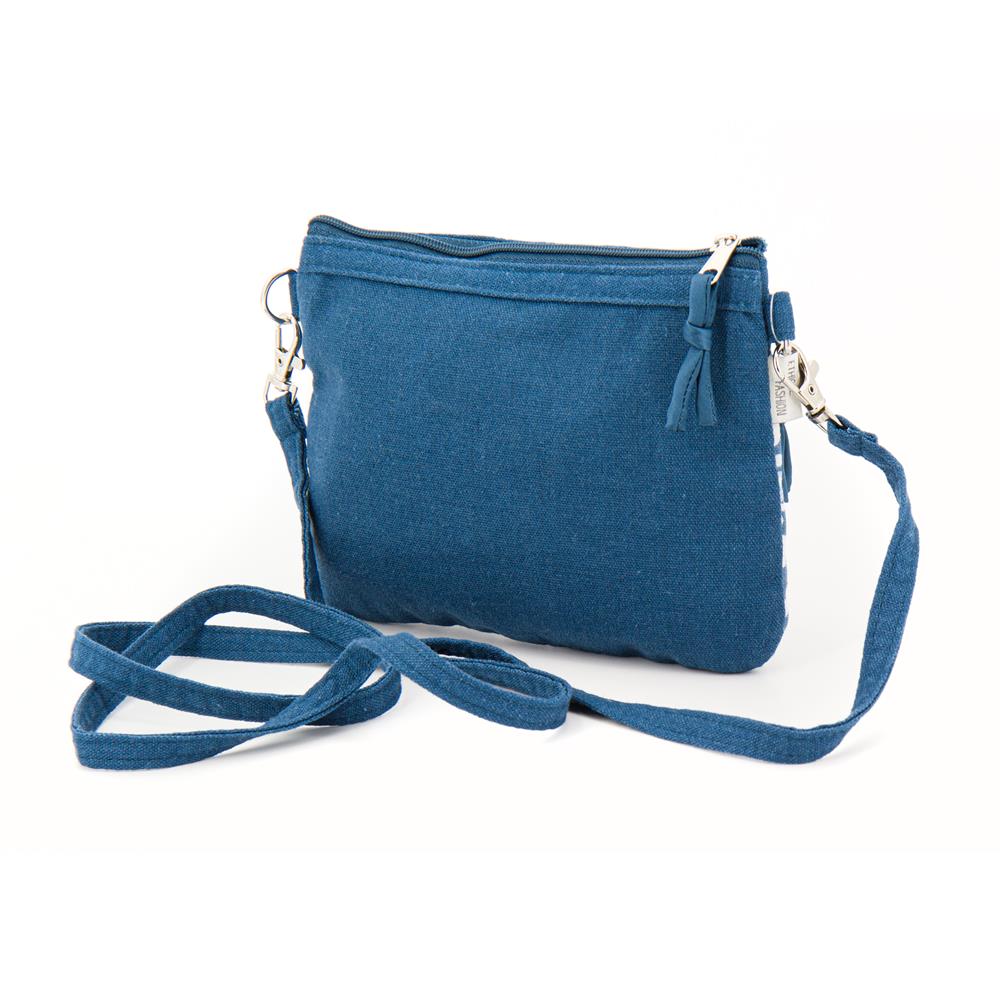 Borsa mini con tracolla rimovibile in lino stampato su colore base blu denim. Due scomparti con zip e interni foderati. 20 x 14cm