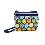 Borsa mini con tracolla rimovibile in tessuto PVC impermeabile. Stampa foglie multicolore su colore base blu. Due scomparti con zip e interni foderati.