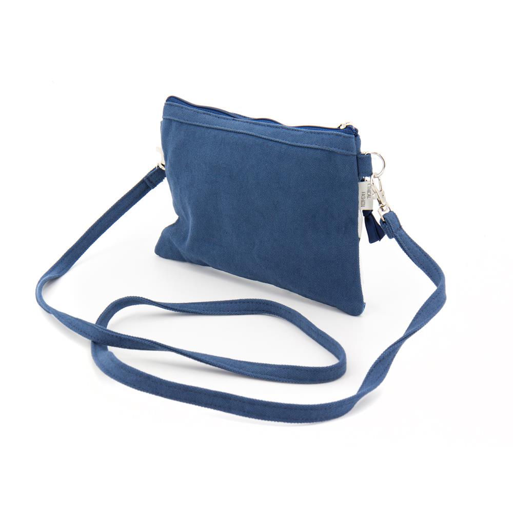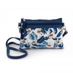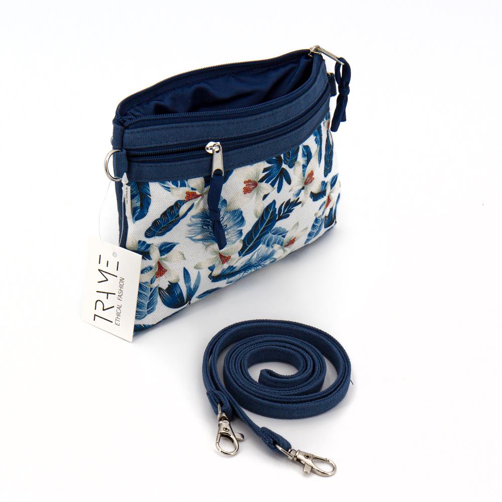 Borsa mini con tracolla rimovibile in cotone canvas stampato su colore base blu cobalto. Due scomparti con zip e interni foderati. 20×14 cm