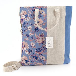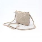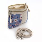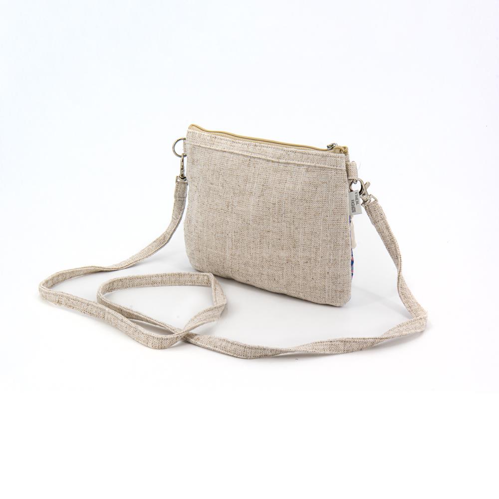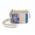 Borsa mini con tracolla rimovibile in mix di tessuti e fantasie su base lino ecrù. Due scomparti con zip. Interni foderati. 20×14 cm