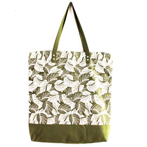 Borsa shopper grande in cotone canvas stampato su colore base verde oliva. Dotata di due manici. Chiusura con zip. Interno foderato con una tasca con zip.