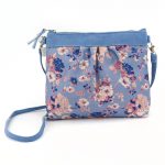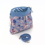 Borsa a tracolla media di forma tondeggiante in cotone broccato,fantasia floreale su colore base carta da zucchero e cotone canvas colore fiordaliso. Dettaglio arricciato sul fronte. Tracolla rimovibile. Chiusura con zip. Interno foderato e una tasca con zip. 25x21x4 cm