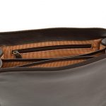 Borsa a tracolla piccola dalla forma rettangolare in morbida nappa bovina con chiusura a zip. Tracolla regolabile. Interno foderato in cotone a righe con tre comparti definiti, una tasca piccola con zip ed una senza.