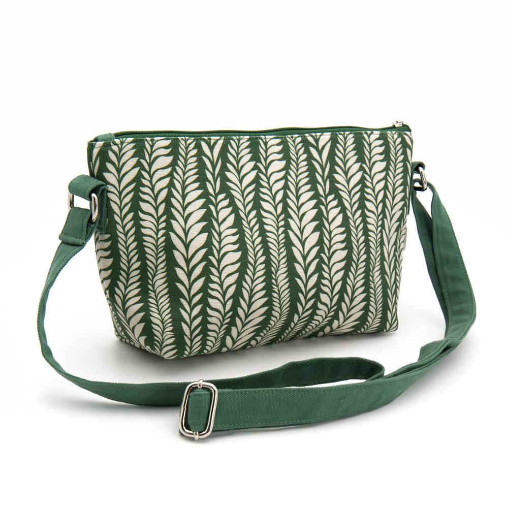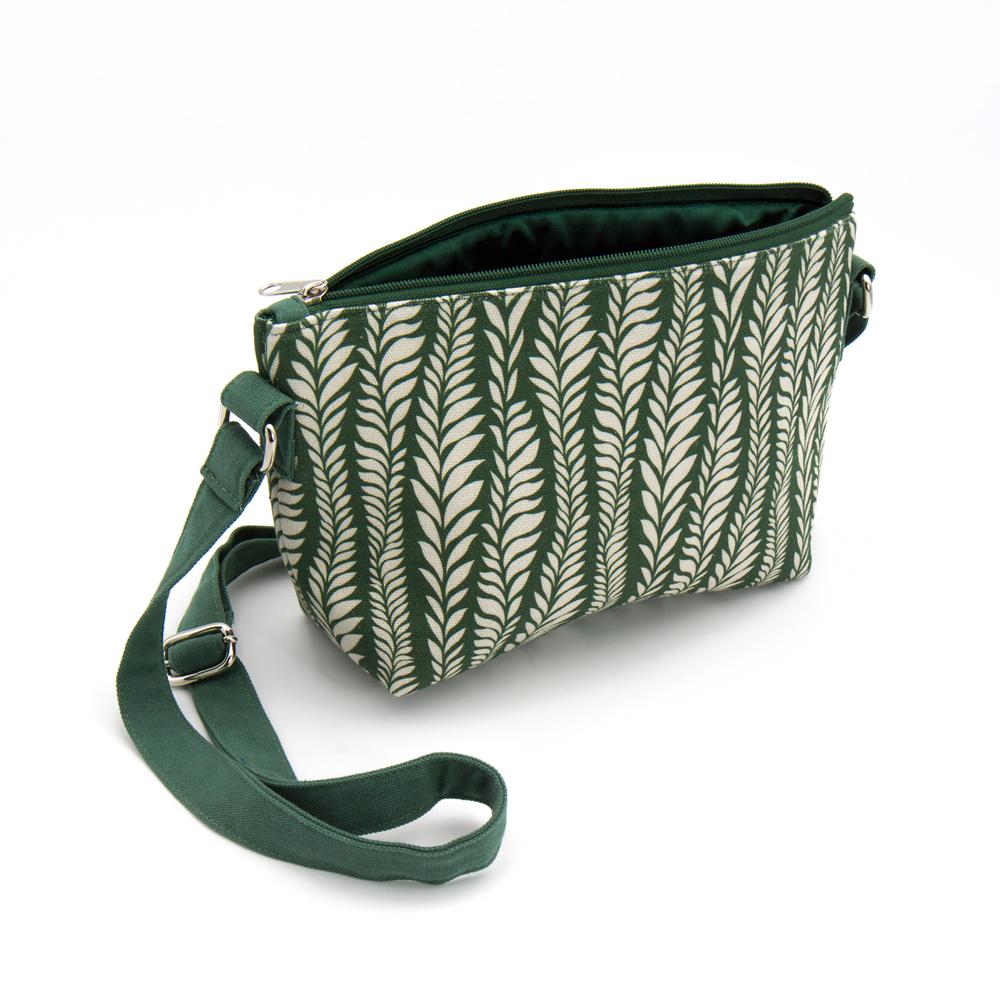 Borsa a tracolla media dalla forma a prisma in cotone canvas stampato su colore base verde. Tracolla regolabile e chiusura con zip. Interno foderato e una tasca con zip.