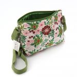 Borsa a tracolla media dalla forma a prisma in cotone broccato con fantasia floreale colore base cipria e cotone canvas colore verde. Tracolla regolabile e chiusura con zip. Interno foderato e una tasca con zip. 29x16x 9 cm