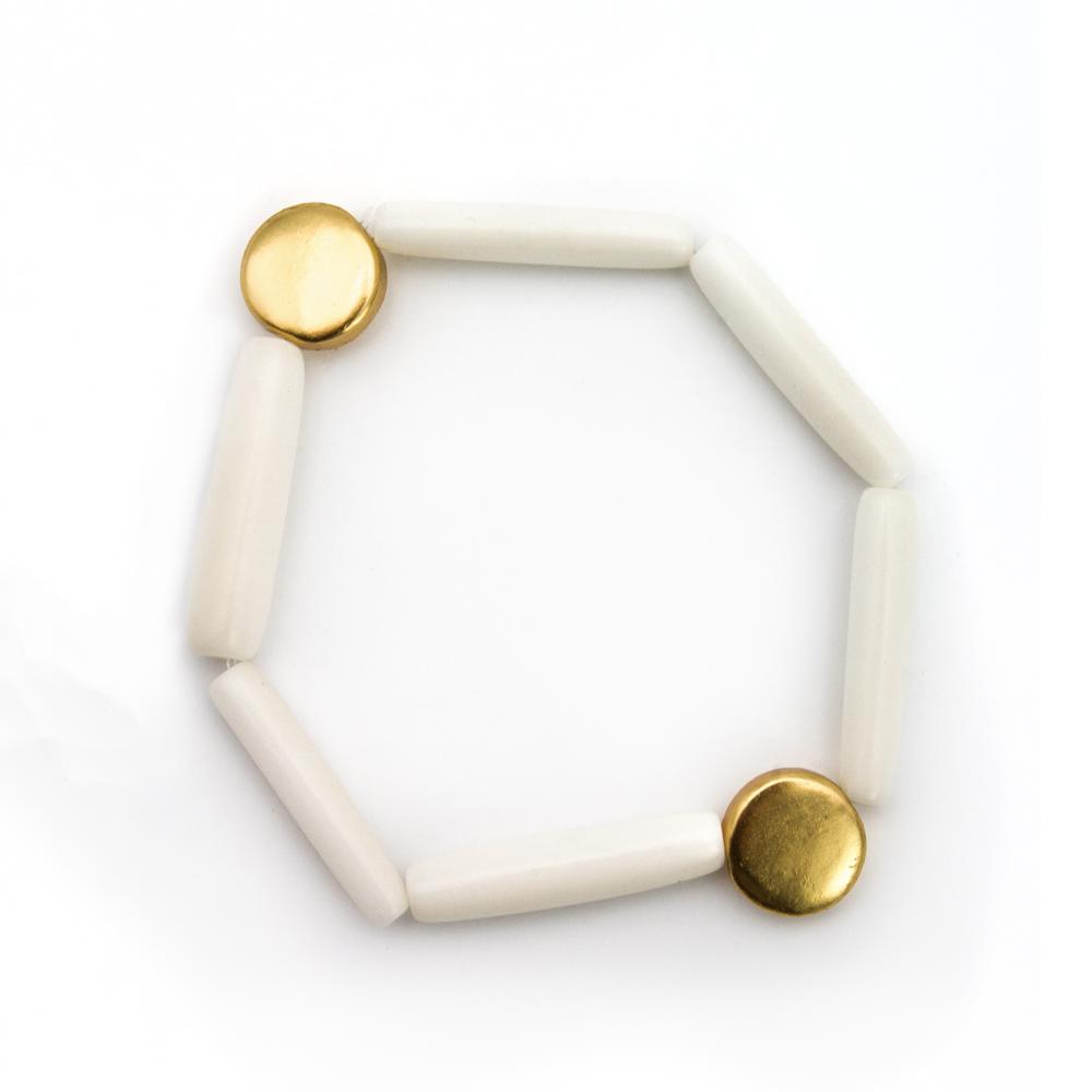 Bracciale elastico con cilindri in tagua e due dischi in metallo placcato oro. Diametro interno 6 cm