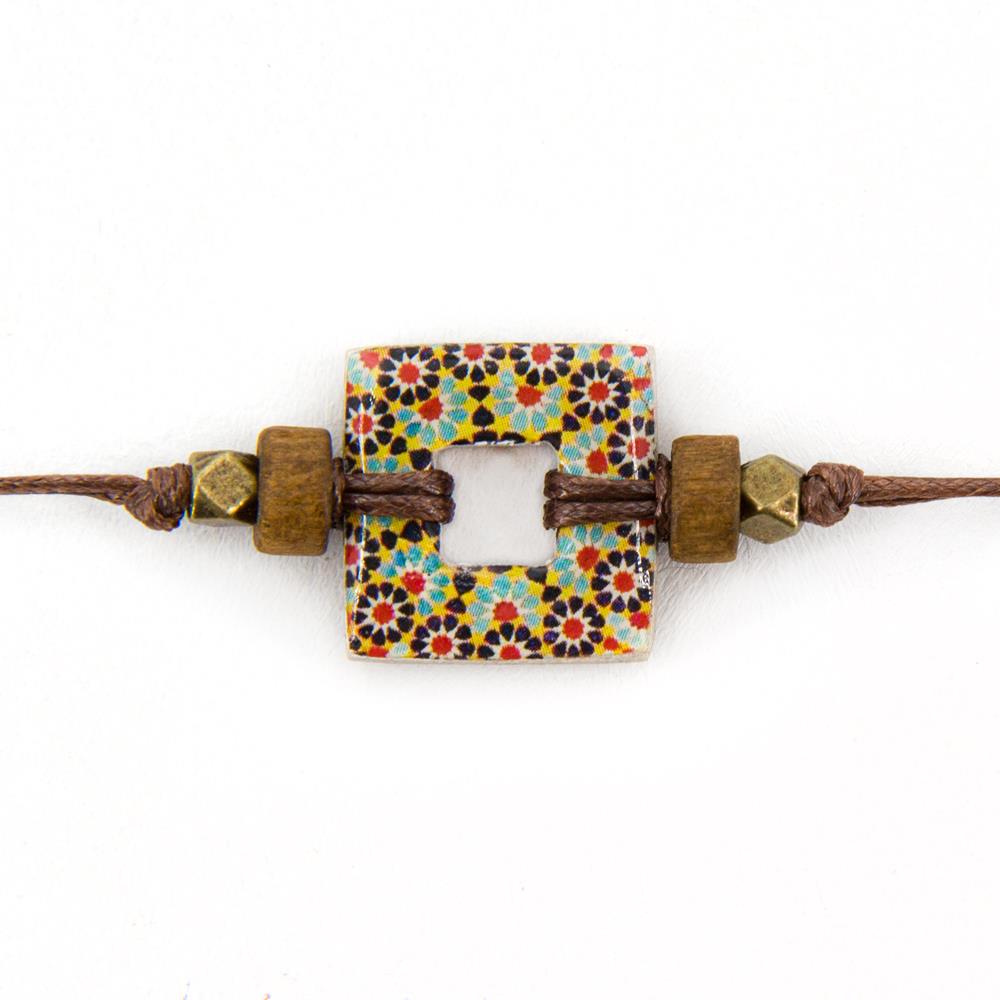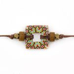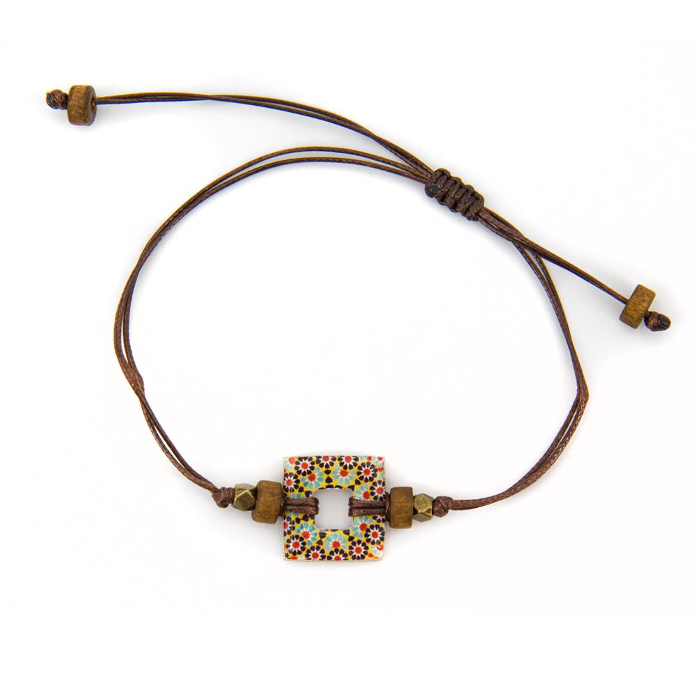 Bracciale con ciondolo a forma di cornice in ceramica a freddo decorata su cordino in cotone cerato regolabile con nodo scorrevole. rosso, arancio, azzurro 1,6cm x1,6cm – cordino massima estensione 13cm ceramica a freddo decorata