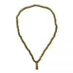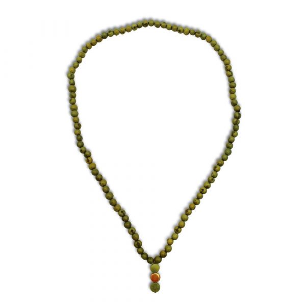 Collana lunga di perle acai con due minidischi in tagua intercalati ad un elemento in metallo placcato oro. Dimensioni: lunghezza 43 cm