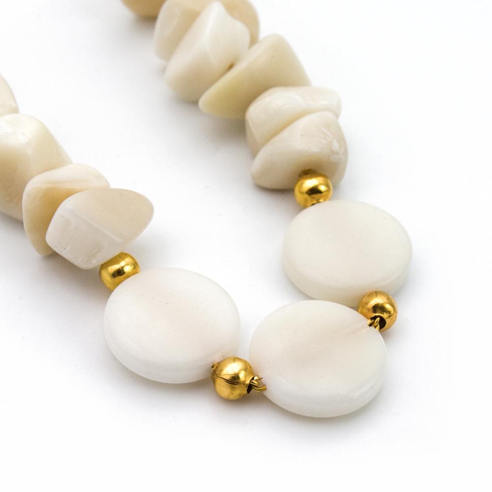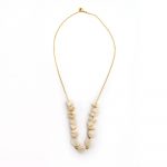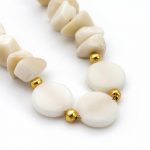 Collana corta con elementi irregolari di tagua, 3 dischi di tagua e piccole perline in metallo placcato oro su una sottile catenina in metallo placcato oro. Lunghezza collana 23 cm