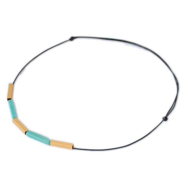 Collana corta composta da piccoli tubi in tagua alternati a tubicini placcati in oro su cordino in cotone regolabile