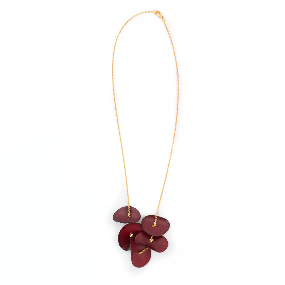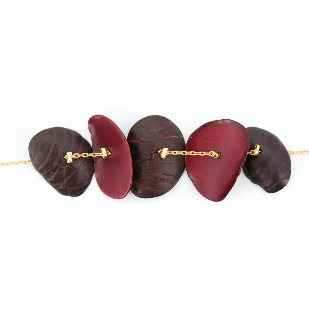 Girocollo con sottile catenina in metallo placcato oro anallergico arricchito da 5 sottili pezzi di tagua. Chiusura a moschettone. Dimensione: lunghezza 22 cm