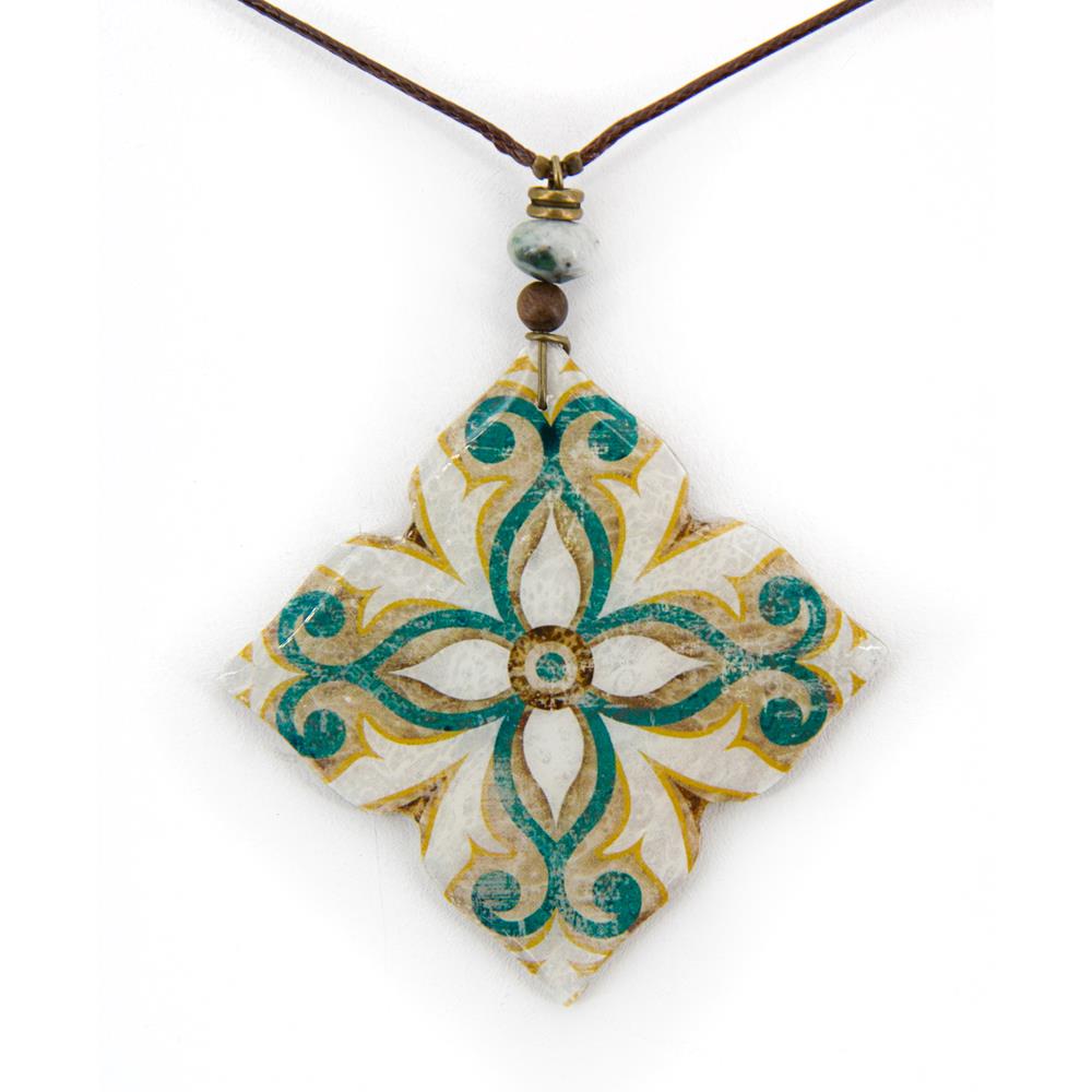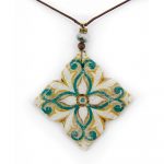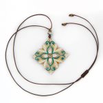 Collana con ciondolo a forma di primula in ceramica a freddo decorata su un sottile cordino di cotone cerato regolabile con nodo scorrevole. Piccole perline di vetro illuminano il ciondolo. beige, verde, bianco cordino 40cm – dimensione ciondolo 9cm ceramica a freddo decorata