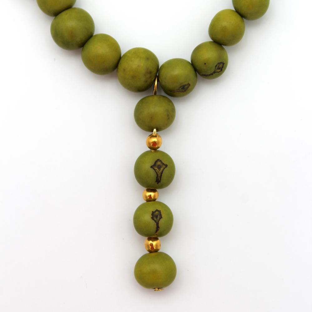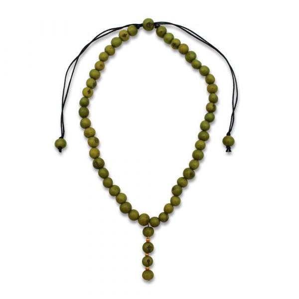 Collana media di perle di acai e piccole perline in metallo dorato su cordino in cotone regolabile. Dimensione: 36 cm massima estensione