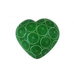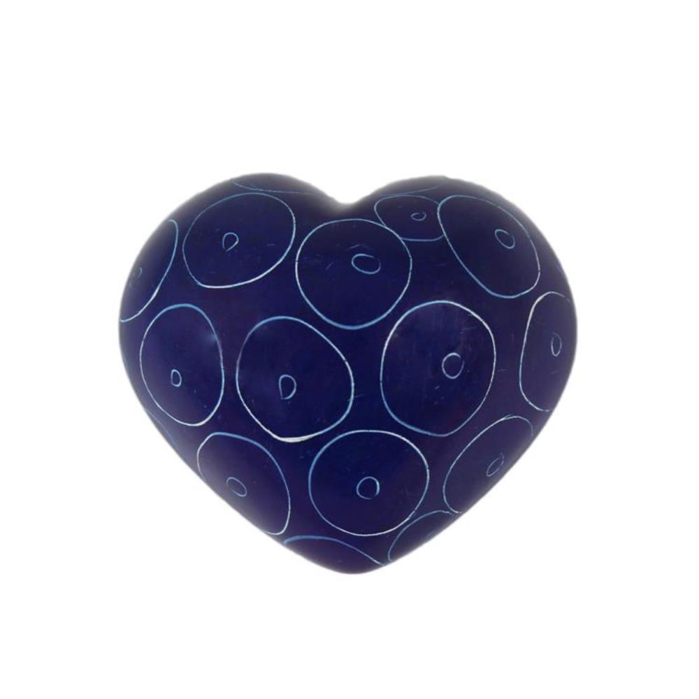 Cuore bomboniera blu con dettagli contorno pallini bianchi.