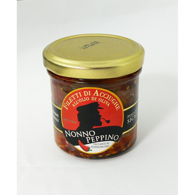 Home ALIMENTARI Conserve, Condimenti e Sottoli Filetti di acciughe c/peperoncino 160g
