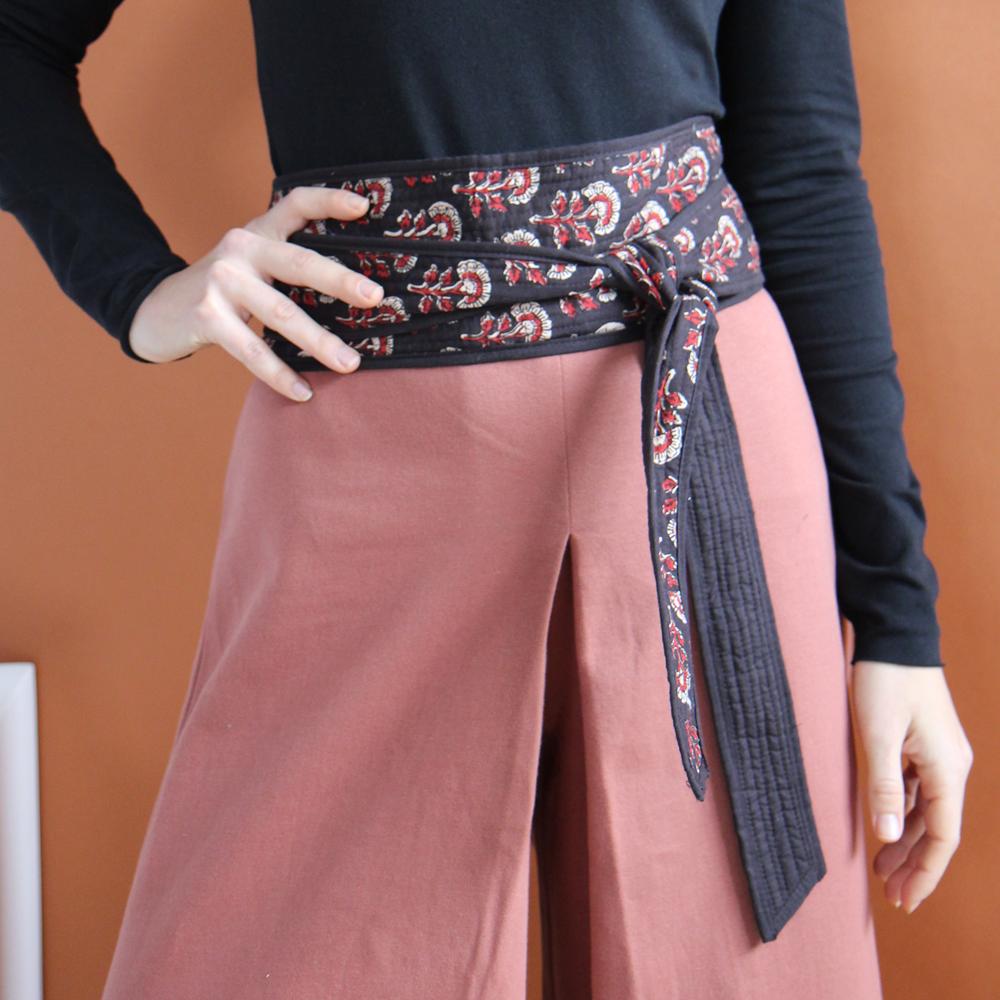 Cintura fusciacca reversibile, trapuntata in cotone stampato a mano block print disegno Girasoli, colore mattone e beige su sfondo nero