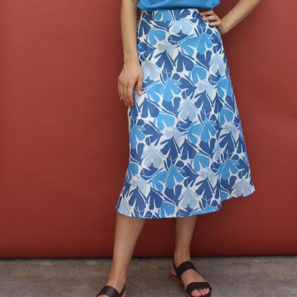 58% lino – 42% cotone (100gsm) stampato con fodera in cotone, stampa Ginko toni dell’azzurro mare