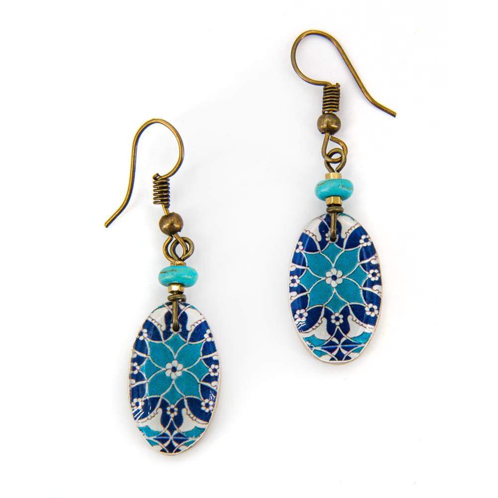 Orecchini pendenti con ciondolo a forma di ovale in ceramica a freddo decorata, illuminati da piccole perline in vetro. Chiusura con gancio ad amo in metallo anallergico colore bronzo effetto anticato. blu, azzurro, bianco lunghezza 4,5cm ceramica a freddo decorata