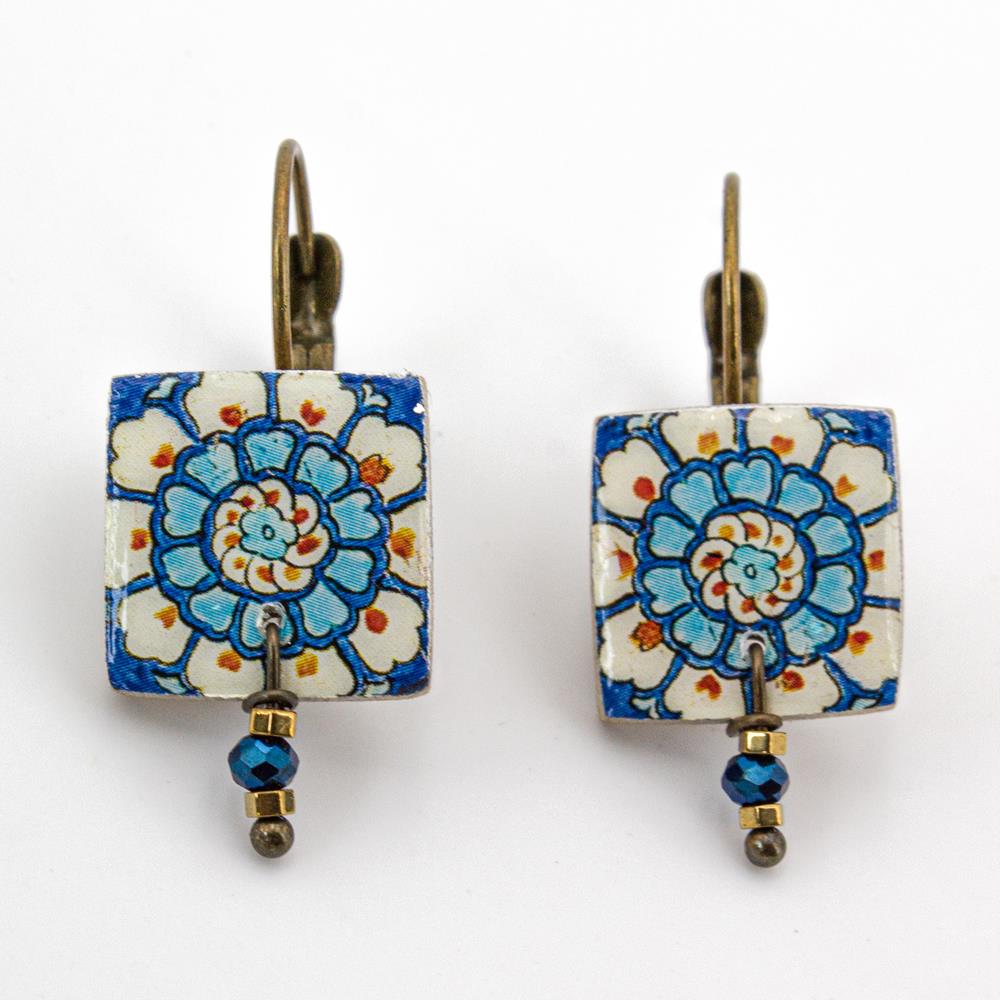 Orecchini a monachella con ciondolo a forma di quadrato in ceramica a freddo decorata, illuminati da piccole perline in vetro. Chiusura con gancio a monachella in metallo anallergico colore bronzo effetto anticato azzurro, blu, rosso, bianco lunghezza totale 3,5cm – quadratino 1,5×1,5 cm ceramica a freddo decorata