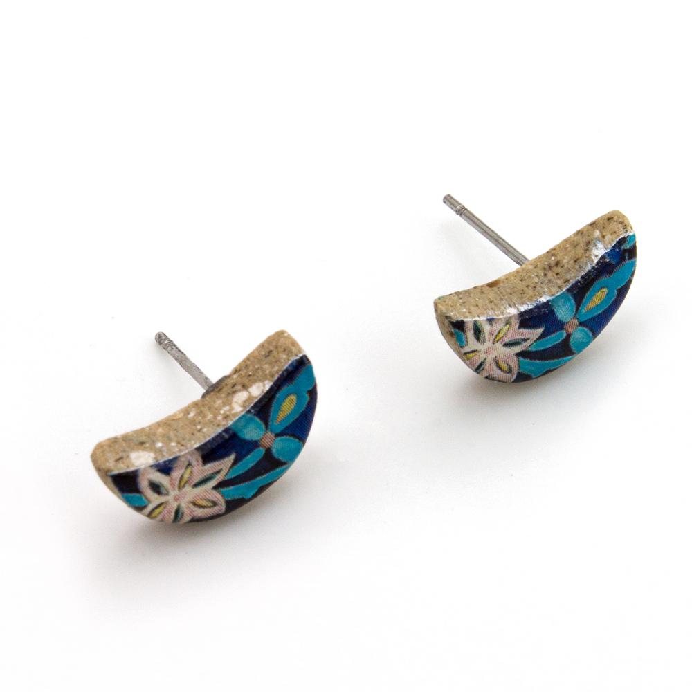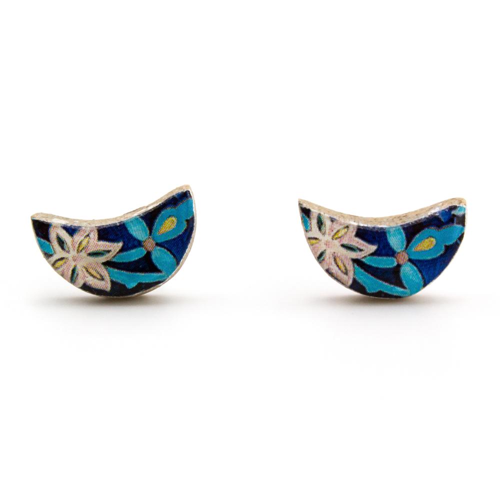 Orecchini a perno a forma di mezza luna in ceramica a freddo decorata. Chiusura a perno in metallo anallergico.