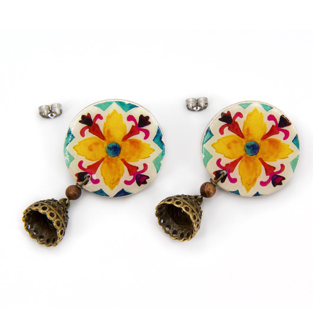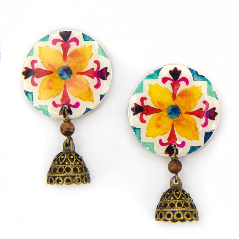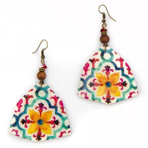 Orecchini a perno a forma di moneta in ceramica a freddo decorata, con ciondolo decorativo. Chiusura a perno in metallo anallergico. bianco, giallo azzurro, rosso lunghezza 5cm ceramica a freddo decorata