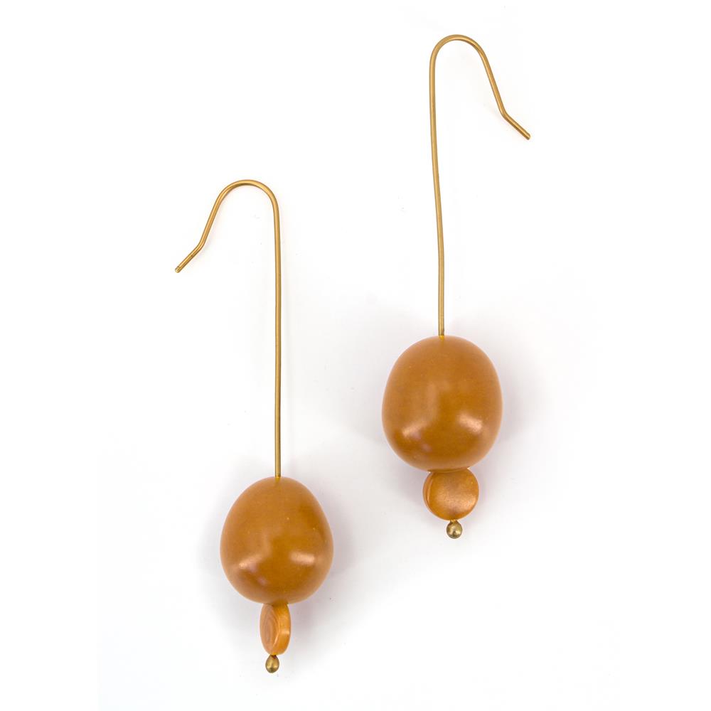 Orecchini pendenti con un seme di chicon e un piccolo disco in tagua. Gancio a stelo in metallo placcato oro anallergico. Dimensione: 6,5 cm
