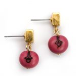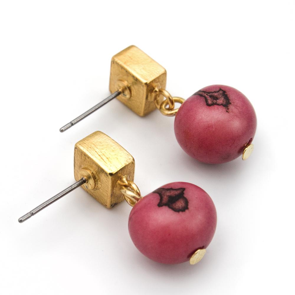 Orecchini pendenti con elemento a forma di cubo in metallo placcato oro e una perla di acai. Chiusura a perno in acciaio inossidabile anallergico. Lunghezza orecchino 2 cm